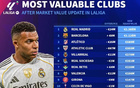 德转西甲俱乐部身价排名:皇马13.8亿第1,最低奥维耶多5840万